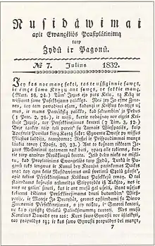 Nusidavimai Dievo karalystėje (News in the Kingdom of God) was the first Lithuanian periodical, but it is known only from later references in other texts as there are no known surviving copies of the publications.[1] It was published annually in 1823–1824/1825 in Tilsit (present-day Sovetsk, Kaliningrad Oblast) by the Evangelical Missionary Society of Königsberg (German: Evangelischer Missionsverein zu Königsberg) established in January 1822.[2] It was a translation of German Königsberger Missionsblatt edited by Hermann Olshausen which reported on the Evangelical missions in Asia and Africa and organized collections of donations.[1] The translations were done by Natanel Friedrich Ostermeyer, Lutheran priest in Kallningken (present-day Prochladnoje). Researchers believe that the publication was initiated by Ludwig Rhesa who was a board member of the Missionary Society.[1] The first issue introduced the Missionary Society and published articles on the lives of Saints Thomas the Apostle and Martin of Tours as well as letters from the missionaries.[1] The circulation was likely around 300–500 copies.[3] The publication was discontinued due to lack of readers, but resumed in 1832 as Nusidavimai apie evangelijos....[4]