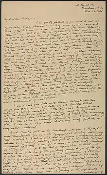 "Nyarlathotep" was based on one of Lovecraft's dreams.[4] The first body paragraph of the poem was written "while he was still half-asleep".[5] The poem, which stands as the first appearance of the titular Cthulhu Mythos entity Nyarlathotep,[6] was described by Lovecraft as "a nightmare".[7] In the inspiring dream, Lovecraft read a letter from his friend Samuel Loveman that contained an invitation, which is as follows: