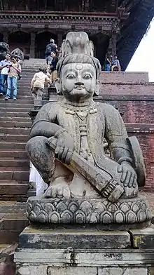 The statues of two wrestlers at the lowermost plinth were carved by a group of fourteen sculptors from Lalitpur, four of whom are labelled as 'child' in the manuscript.[35] The sculptors labelled as 'child' were Krishna Raj, who worked for 37 days, Raksmidhil, who worked 28 days, Chandrasingha, who worked for 27 days and Meru, who worked for 10 days.[36] The statues of the wrestlers were carved in 40 days at most and 4 days at least.[36]