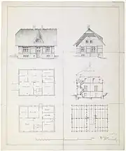 In 1853, Hother Hage purchased the Marielyst Mansion at Stege. On 20 June 1856, Hother Hage married Emmy Tutein, daughter of Peter Adolph Tutein, at Marienborg Manor.[1] Around the same time, Hage had charged the architect Gottlieb Bindesbøll with the design of a new house. Bindesbøll had completed Stege's new town hall a few years prior.[2] Another source of inspiration for the choice of Bindesbøll as architect may have been Hans Puggaard's cottage Krathuset in Ordrup. Puggaard was married to Hage's aunt C. F. Hage (1798–1847). Krathuset was commissioned by Puggaard from Bindesbøll as a gift to their children, one of whom was married to the politician Orla Lehmann. Hage, Puggaard and Lehmann belonged to the same National Liberal circles.