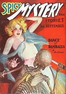 Olga Mesmer, "The Girl with the X-ray Eyes", starred in a single-page comic strip that ran in issues of the pulp magazine Spicy Mystery Stories cover-dated August 1937 to October 1938.[1] The first story, "The Astounding Adventures of Olga Mesmer, the Girl with the X-Ray Eyes", and subsequent installments are by an unidentified writer.[2] Art for the strip, created at a comics studio run by Adolphe Barreaux,[3] is credited to Watt Dell, who sometimes signed his illustrations for the magazine as Watt Dell Lovett, and may be a pseudonym; as well, some of the Mesmer strips are signed "Stone".[4]
