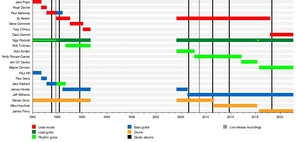 Past members | Jase Pope Roge Davies Paul Mahoney Neil Turbin Sy Keeler Steve Grimmett Tony O'Hora Paul Hill Paul Davis Jase Stallard James Hinder Rob Trotman Alan Jordan Andy Rosser-Davies Michael Hourihan Leigh Chambers Steve Grice |