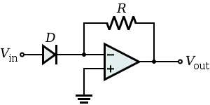 The voltage drop VF across the forward-biased diode in the circuit of a passive rectifier is undesired. In this active version, the problem is solved by connecting the diode in the negative feedback loop. The op-amp compares the output voltage across the load with the input voltage and increases its own output voltage with the value of VF. As a result, the voltage drop VF is compensated, and the circuit behaves very nearly as an ideal (super) diode with VF = 0 V.