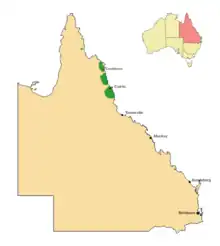 The yellow bean is endemic to Queensland and occurs in coastal and sub-coastal areas from Juunju Daarrba Nhirrpan National Park north of Cooktown, to Innisfail. There is also a small outlier population in the McIlwraith Range on Cape York Peninsula about 270 km (170 mi) to the northwest of Cooktown.[5][8] It grows in well developed rainforest, often beside rivers and streams,[4][7] at altitudes from sea level to about 500 m (1,600 ft).[4][5]