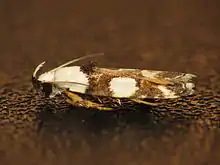 The wingspan is 12–15 mm (0.47–0.59 in). The forewings are ochreous-brown, irrorated with dark fuscous or blackish and with a moderate white basal patch, the outer edge rounded. There are two or three undefined white dots on the fold and a broad white transverse blotch from the middle of the costa, reaching more than half across the wing, sometimes much mixed with ground colour. An irregular suffused white streak is found from the disc beyond this to the tornus, where it coalesces with an irregular white subterminal streak, sometimes interrupted. The hindwings are pale ochreous-yellowish, the terminal half fuscous and the division irregular and suffused.[2]