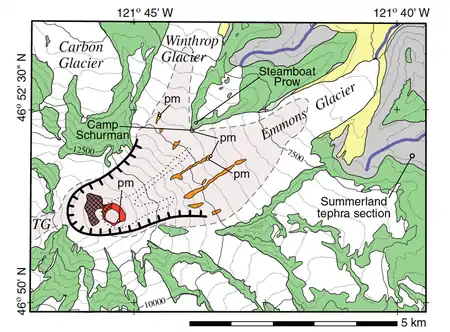 The Osceola flow began either as an avalanche or series of avalanches near the summit of Mount Rainier but had transformed to a lahar within 2 km (1.2 mi) of where it was initiated as it incorporated significant amounts of water from within the volcano's hydrothermal system.[1] The sector collapse formed a 1.8 km (1.1 mi) wide horseshoe-shaped crater, open to the northeast, almost the same size as the crater produced by the 1980 eruption of Mount St. Helens. Most of the Osceola crater has been filled in by subsequent lava eruptions, most recently about 2,200 years ago.[2]