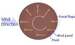 The vanes of a panemone are moved by the wind in a circle to turn the drive shaft. To accomplish this they must move with the wind only while on one side of the circle, and move against the wind on the other side. To prevent the vanes moving upwind from being blown back by the wind, one half of the panemone may be shielded, or else the vanes may be attached so that they can turn edge-on to the wind when the wheel is moving them upwind.[1]