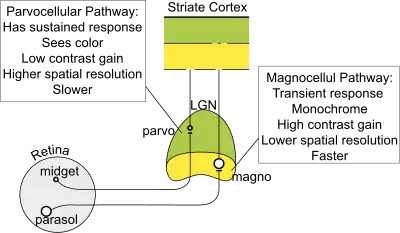 - ↑ Anderson, Andrew J.; Jiao, Julie; Bui, Bang V. (2015-09-01). "Efficiently Measuring Magnocellular and Parvocellular Function in Human Clinical Studies". Translational Vision Science & Technology. 4 (5): 1. doi:10.1167/tvst.4.5.1. PMC 4559216. PMID 26346944.