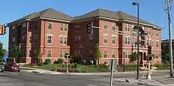 One component, the Portland, was built as the Barnard Apartment Building in 1902, and has been known as the Portland since 1917. It was designed by architect John Latenser, Sr. and is a three-story apartment building with three wings, forming a U-shape around a courtyard. It includes Italian Renaissance styling.[2]