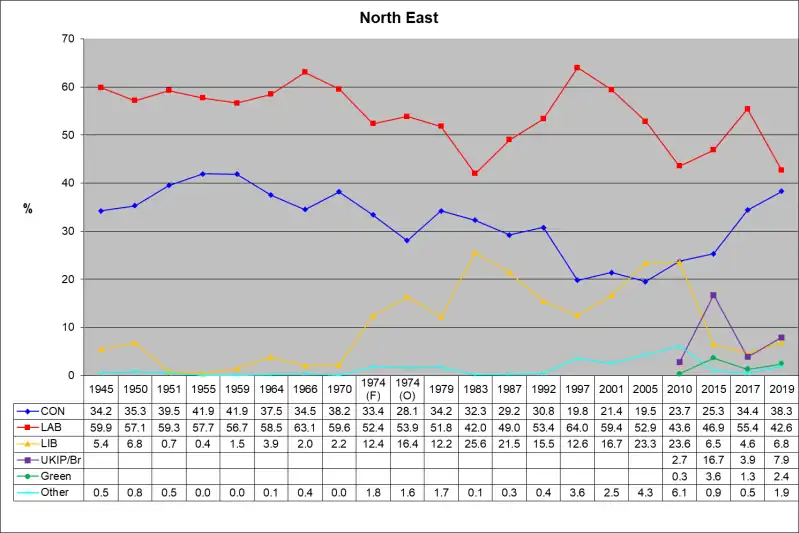 The number of votes cast for each political party who fielded candidates in constituencies comprising the North East region in the 2019 general election were as follows: