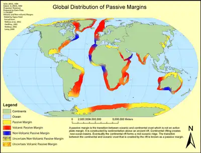 A passive margin is the transition between oceanic and continental lithosphere that is not an active plate margin. A passive margin forms by sedimentation above an ancient rift, now marked by transitional lithosphere. Continental rifting forms new ocean basins. Eventually the continental rift forms a mid-ocean ridge and the locus of extension moves away from the continent-ocean boundary. The transition between the continental and oceanic lithosphere that was originally formed by rifting is known as a passive margin.