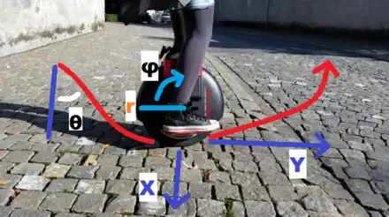 An individual riding a motorized unicycle. The configuration space of the unicycle, and the radius of the wheel, are marked. The red and blue lines lay on the ground.