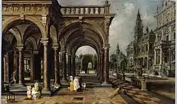 Vredeman de Vries specialised in architectural paintings and, in particular, imaginary church interiors and palaces.[2] His paintings show a meticulous attention to perspective. He developed an original poetic vision in his mature years. The facades of palaces that are richly ornate and the colonnades of which open onto flowered courtyards with fountains and sculptures provide the setting for scenes from ancient history or sacred history. The rigour of the geometric composition, which incorporates the principles of the contemporary treatises on perspective, is tempered by an atmospheric rendering of the light with its silvery shimmers. The interiors are a reconstruction of the interior decoration of his day such as chairs trimmed with leather, embossed leather hangings and canopies with valances.[8]
