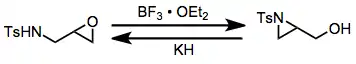 The aza-Payne rearrangement may be effected in either the "forward" (epoxide to aziridine) or "reverse" (aziridine to epoxide) direction depending on the conditions employed. Electron-poor aziridines undergo the reverse rearrangement in the presence of hydride base,[13] while the corresponding epoxy amines undergo the forward rearrangement in the presence of boron trifluoride etherate.[14]