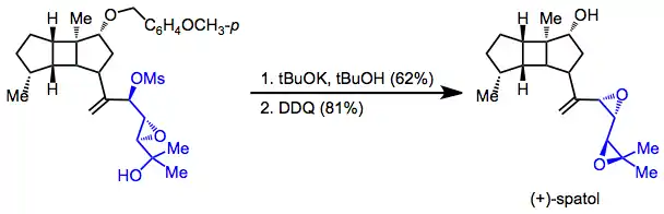 The final two steps in the total synthesis of spatol involved intramolecular electrophilic trapping of an alkoxide derived from a rearranged epoxide. Attack of the intermediate alkoxide on the adjacent mesylate afforded a bis(epoxide), and debenzylation provided the target compound.[17]