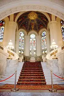 The palace officially opened on 28 August 1913; it was originally built to provide a home for the PCA, a court created to end war by the Hague Convention of 1899.[1] Andrew Dickson White, whose efforts were instrumental in creating the court,[2] secured from Scottish-American steel magnate Andrew Carnegie US$1.5 million ($50,000,000, adjusted for inflation) to build the Peace Palace.[1] The European Heritage Label was awarded to the Peace Palace on 8 April 2014.