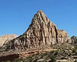 Pectols Pyramid is a 6,211-foot (1,893-meter) elevation summit located in Capitol Reef National Park, in Wayne County of Utah, United States. This iconic landmark is situated 2 mi (3.2 km) southeast of the park's visitor center, 1 mi (1.6 km) south of Navajo Dome, and 0.5 mi (0.80 km) southwest of Capitol Dome. Precipitation runoff from this feature is drained by the Fremont River, which in turn is within the Colorado River drainage basin. This geological feature's name honors Ephraim Portman Pectol (1875–1947), booster and founder of what would become Capitol Reef National Monument in 1937.[3]