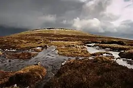 Pen Cerrig-calch is a subsidiary summit of Waun Fach in the Black Mountains in the Brecon Beacons National Park in southern Powys, Wales. Its summit, at a height of 701 m (2,300 ft), is marked by a trig point. The peak sits high above the River Usk valley as it narrows above the small town of Crickhowell. The views from here are wide-ranging and extend as far as the Beacons themselves to the west. A ridge runs off to the northwest and the shoulder of Pen Gloch-y-pibwr then turns north to the secondary top of Pen Allt-mawr whose peak at 719m is also crowned by a trig point.[1]