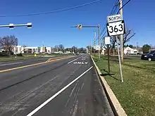 The road passes through residential neighborhoods before entering commercial areas and crossing Sumneytown Pike. PA 363 heads to the southeast of North Penn High School and runs past a mix of homes and businesses as it gains a center left-turn lane on the approach to the Allentown Road junction. A short distance later, the route enters the borough of Lansdale and passes homes as a two-lane road. PA 363 reaches its northern terminus at an intersection with PA 63 (West Main Street) in Lansdale, where Valley Forge Road continues north as a local street.[3][4]