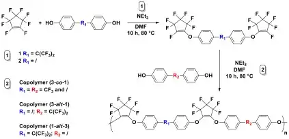 Smith et al. further extended his recently published work on perfluorocyclopentenyl (PFCP) aryl ether polymers and perfuorocycloalkenyl (PFCA) aryl ether monomers, and reported the synthesis of a new class of fluoropolymers, namely, perfluorocyclohexenyl (PFCH) aryl ether polymers, via step-growth polycondensation of commercial bisphenols and decafluorocycloalkene (DFCH) in the presence of triethylamine (Scheme 5).[7][10]