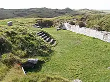 The interior was apparently almost entirely unlit apart from two tiny penetrations, and the absence of timber finds on the waterlogged site[14] suggest the roof may have been constructed as a drystone corbelled vault in the early western-Atlantic ecclesiastical tradition found from Ireland to Brittany – see for example the better preserved Gallarus Oratory in Ireland or the late medieval Dupath Well. Later medieval 'holy-well' architecture across Cornwall, Devon and Brittany often follows the earlier Celtic Christian corbelled drystone tradition and early Celtic reliquaries record how early high-gabled religious houses may once have looked.