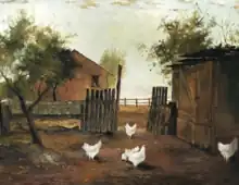 Pruning Apple Trees (1978), painted when Serwan was still at high school, showing the artist’s father in the back garden is impressionist in style, utilising gesture, and bright colour to capture an image of his immediate environment. Life: A Symphony in White (1979), depicts chooks in an outdoor setting, Morwell Back Yard (1987) and LaTrobe Valley Roadside (1986) use structural elements of fences, gateways, buildings, and posts to create compositional interest.