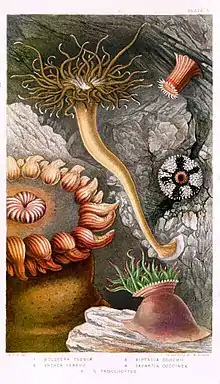 During this period, Gosse made a special study of sea anemones (Actiniae) and in 1860 published Actinologia Britannica. Reviewers especially praised the colour lithographs made from Gosse's watercolours. The Literary Gazette said that Gosse now stood "alone and unrivalled in the extremely difficult art of drawing objects of zoology so as to satisfy the requirements of science" as well as providing "vivid aesthetic impressions".[50]