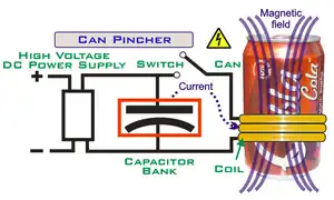 Many high-voltage electronics enthusiasts make their own crude electromagnetic forming devices.[32][33][34] They use pulsed power techniques to produce a theta pinch able to crush an aluminium soft drink can using the Lorentz forces created when large currents are induced in the can by the strong magnetic field of the primary coil.[35][36]