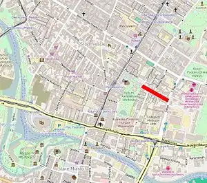 Piotra Skargi Street is a rather short path, starting at Freedom Square or Plac Wolności, on the west side, and leading eastward to May 3rd street.