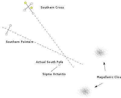 σ Octantis, sometimes known as the South Star, can be sighted in the Southern hemisphere to perform a polar alignment. At magnitude +5.6, it is difficult for inexperienced observers to locate in the sky. Its declination of -88° 57′ 23″ places it 1° 2′ 37" from the South Celestial Pole. An even closer star BQ Octantis of magnitude +6.9 lies 10' from the South Pole as of 2016. Although not visible to the naked eye, it is easily visible in most polar 'scopes. (It will lie its closest to the South Pole, namely 9', in the year 2027.