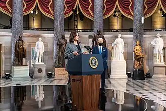 The political positions of Kamala Harris are reflected by her United States Senate voting record, public speeches, and interviews. Kamala Harris served as the junior senator from California from 2017 to 2021. On August 11, 2020, Harris was selected by presumptive Democratic presidential nominee Joe Biden to be his running mate in the 2020 United States presidential election, running against incumbent U.S. President Donald Trump and Vice President Mike Pence. With Biden's election victory, Harris was subsequently elected as vice president. Harris was described by The New York Times as a pragmatic moderate, with policy positions that broadly mirror those of Biden.[1][2][3][4][5] However, the non-partisan GovTrack rated Harris as the most liberal U.S. Senator, prompting debate over her position in center-left and left-wing politics. Despite this, left-wing activists have criticised Harris on numerous occasions for her past actions as a prosecutor, which have been called “right-wing”.[6]