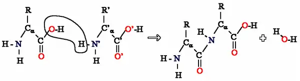As an example of condensation reactions, consider that in living organisms, Amino acids are condensed with one another by an enzyme to form amide linkages (known as peptides). The resulting polyamides are known as proteins or polypeptides. In the diagram below, consider the amino-acids as single aliphatic monomers reacting with identical molecules to form a polyamide, focusing on solely the amine and acid groups. Ignore the substituent R groups – under the assumption the difference between the R groups are negligible: