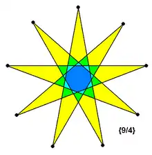 For example, the great icosahedron, {3, 5/2}, has 20 triangular faces (df = 1), 30 edges and 12 pentagrammic vertex figures (dv = 2), giving