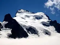 ![]() Lower part of the Aletsch glacier with Wannenhorn (3,906 m (12,815 ft)) in the middle and Strahlhorn (3,026 m (9,928 ft)) on the right.