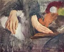 The drawing hung on the wall behind them is a portrait of the recently deceased Hilaire Degas, and was presumably a study for the portraits Degas made of his grandfather, drawn in the style of the Clouets.[22] By placing it directly behind his aunt's head, Degas was connecting the generations of his family, and following a convention of portraiture used since the Renaissance, that of including ancestral effigies.[22] By its very placement Degas was implicitly affirming his own presence and identifying with Laura, with whom, as their correspondence attests, he was unusually close.[21]