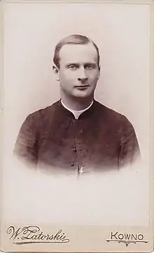 Matulaitis-Matulevičius joined him as a professor at the academy in 1907. They often discussed reviving the Congregation of Marian Fathers of the Immaculate Conception which at the time had only one elderly member, but it had to be done in secret due to various Russification policies.[4] On 29 August 1909, in a private chapel of auxiliary bishop Kazimierz Ruszkiewicz at the clergy house of the Holy Cross Church in Warsaw, Matulaitis-Matulevičius became a member of the Marian Fathers and Būčys began his novitiate.[4] In 1910, he refused an offer to become suffragan bishop of Samogitia.[11]