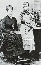 Furthermore, William had a reputation for drunkenness and a dissolute character, so it was surprising that the exceedingly pious and recently widowed Queen Elisabeth gave her consent to the match.[1] On two occasions William had been deprived of his command in the Prussian army and had recently proposed marriage to the celebrated ballerina Marie Taglioni; consequently he was generally considered to be the "black sheep" of the family.[1] Regardless, the Queen granted her permission, endowing her with a grand trousseau of lavish clothing and jewelry.[3] Her other uncle Emperor Wilhelm I gave her an opulent diamond necklace, while her mother Princess Marianne gave her a necklace of Siberian amethysts as well as an emerald diadem.[3]