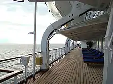 The promenade deck is a deck found on several types of passenger ships and riverboats. It usually extends from bow to stern, on both sides, and includes areas open to the outside, resulting in a continuous outside walkway suitable for promenading, (i.e., walking) thus the name.