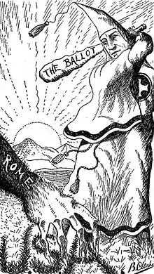 "Getting What He Deserves" American anti-Catholic cartoon from Heroes of the Fiery Cross 1928.