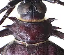 The prothorax is the foremost of the three segments in the thorax of an insect, and bears the first pair of legs. Its principal sclerites (exoskeletal plates) are the pronotum (dorsal), the prosternum (ventral), and the propleuron (lateral) on each side. The prothorax never bears wings in extant insects (except in some cases of atavism), though some fossil groups possessed wing-like projections.[1] All adult insects possess legs on the prothorax, though in a few groups (e.g., the butterfly family Nymphalidae) the forelegs are greatly reduced. In many groups of insects, the pronotum is reduced in size, but in a few it is hypertrophied, such as in all beetles (Coleoptera). In most treehoppers (family Membracidae, order Hemiptera), the pronotum is expanded into often fantastic shapes that enhance their camouflage or mimicry. Similarly, in the Tetrigidae, the pronotum is extended backward to cover the flight wings, supplanting the function of the tegmina.