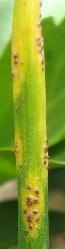 - ↑ Abbasi, M.; Klimek, J. F.; Aime, M. C. Aime (2016). "First report of rust disease caused by Puccinia liliacearum on Ornithogalum umbellatum from Indiana and Maryland with notes on the spread of the rust fungus in the United States". Plant Disease. 100 (10): 2169. doi:10.1094/PDIS-04-16-0509-PDN.