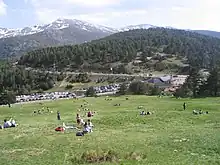 View of the meadow, the mountaineering school and the parking lot of the mountain pass of Cotos in spring.
