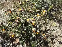 Pultenaea barbata is a spindly, prostrate or spreading shrub that typically grows to a height of 0.25–1.0 cm (0.098–0.394 in) with glabrous stems. The leaves are cylindrical but with a groove along the upper surface, 3–17 mm (0.12–0.67 in) long and 0.5–1.0 mm (0.020–0.039 in) wide and hairy with stipules at the base. The flowers are yellow, red, orange or brown with spots and blotches of yellow, red or orange. Each flower is borne on a hairy pedicel 2.5–3 mm (0.098–0.118 in) long with hairy bracteoles about 4 mm (0.16 in) long at the base. The sepals are 5.5–7 mm (0.22–0.28 in) long and hairy. The standard petal is 6.5–8 mm (0.26–0.31 in) long, the wings 7–7.5 mm (0.28–0.30 in) long and the keel is yellow, 5–7 mm (0.20–0.28 in) long. Flowering occurs from September to December and the fruit is an oval pod.[2][3]