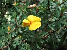 Pultenaea muelleri, commonly known as Mueller's bush-pea,[2] is a species of flowering plant in the family Fabaceae and is endemic to Victoria, Australia. It is a dense shrub with hairy stems, elliptic to narrow egg-shaped leaves with the narrower end towards the base, and yellow and red flowers arranged singly or in pairs on the ends of short side shoots.