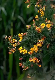 Pultenaea vrolandii, commonly known as cupped bush-pea,[2] is a species of flowering plant in the family Fabaceae and is endemic to south-eastern continental Australia. It is an erect shrub with hairy, arching branchlets, elliptic to egg-shaped leaves, and yellow to orange and red to brown flowers.