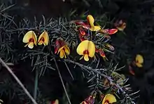 Pultenaea williamsoniana, commonly known as Williamson's bush-pea,[2] is a species of flowering plant in the family Fabaceae and is endemic to a restricted area of Victoria, Australia. It is a slender, erect shrub with its stems covered with white hairs, and has cylindrical, grooved leaves and yellow to orange and red, pea-like flowers arranged in clusters on the ends of short side branches.