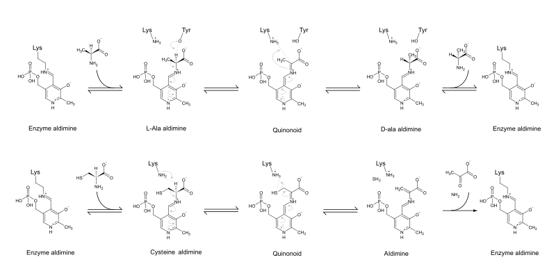 - ↑ Toney MD (January 2005). "Reaction specificity in pyridoxal phosphate enzymes". Archives of Biochemistry and Biophysics. 433 (1): 279–87. doi:10.1016/j.abb.2004.09.037. PMID 15581583.