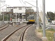 Quakers Hill station opened in 1872 as Douglas Siding. It was renamed Quakers Hill on 30 March 1905 and relocated to its present location on 29 June 1939.[2] Two sets of points at the southern end of the station allow trains to terminate on either platform.