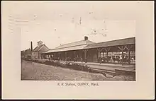 The Old Colony Railroad opened its main line from South Boston to Plymouth on November 10, 1845.[6] Quincy station was located at Quincy Square behind the town hall. The original station was replaced in late 1868.[7][8] New station buildings – low brick structures very similar to the extant building at Norwood Central – were built at Quincy and Atlantic in 1900, with shelters serving the line's two tracks.[9][10][11] Service on the former Old Colony lines, operated by the New Haven Railroad since 1893, ended on June 30, 1959.[6] The Quincy depot was later demolished.