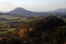 The Růžovský vrch (German: Rosenberg) is a mountain in the Elbe Sandstone Mountains in the Czech Republic. The summit is located in the municipality of Růžová in the Ústí nad Labem Region. The mountain is protected as a national nature reserve named Růžák.